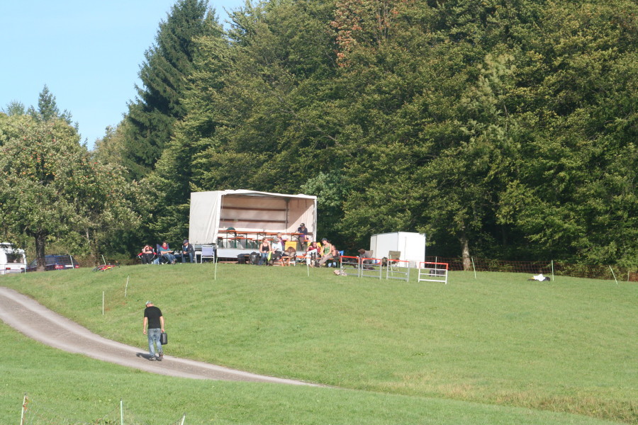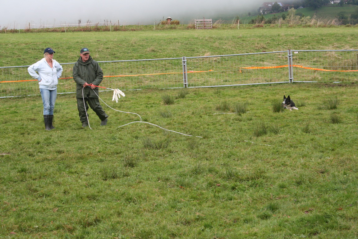 Mittags, bei der zweiten Einheit ging es schon an den Outrun. Distanz ca. 80 m. Da Zoe Bobby zu weit raus lief, kam hier auch gleich die Leine zum Einsatz und Zoe wurde korriegiert. Der nächste Outrun, die Distanz schon etwas grösser, war dann nahezu perfekt. Wieder schön versammeltes Tempo und Zoe lief sauber hinten durch und kam perfekt hinter den Schafen an....